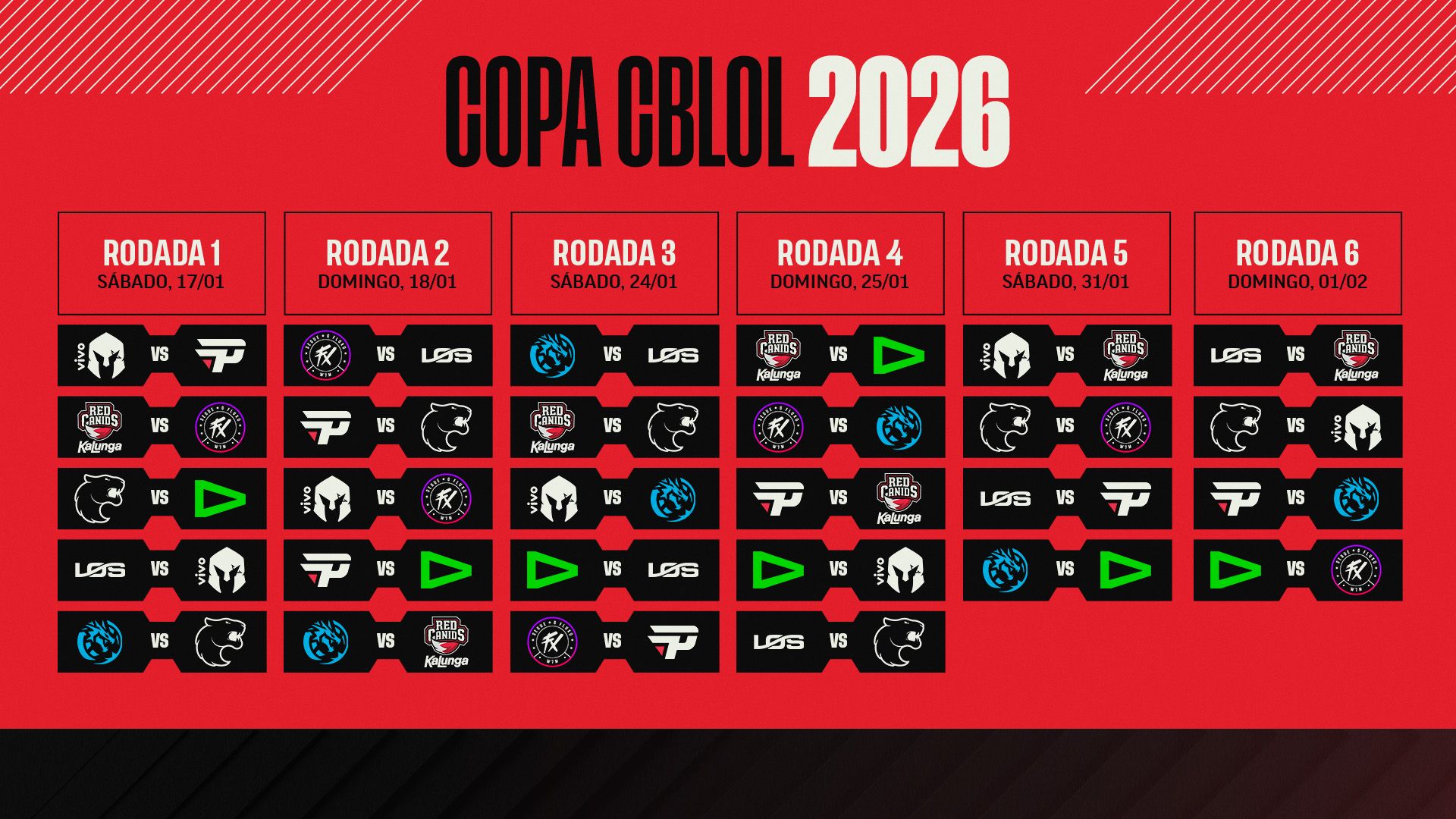 A ação começa forte já no primeiro fim de semana. A fase regular ocorre entre 17 de janeiro e 1º de fevereiro, com jogos aos sábados e domingos a partir das 13h, na Riot Games Arena em São Paulo. É importante notar que, nas primeiras quatro datas, dois times sempre jogarão duas partidas no mesmo dia. No dia 17 de janeiro, a abertura terá Vivo Keyd Stars contra paiN Gaming, seguida por RED Canids x Fluxo, FURIA x LOUD, LOS x Vivo Keyd Stars e LEVIATÁN x FURIA. No domingo, 18, os destaques são Fluxo x LOS, paiN x FURIA e LEVIATÁN x RED Canids.