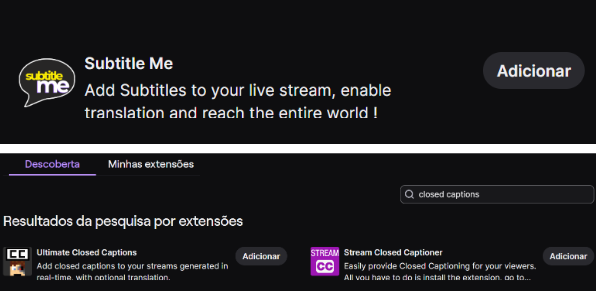 Atualmente, quando vamos na página de extensão da Twitch, digitando as palavras chaves como “closed captions” e “subtitles”, encontramos essas opções: