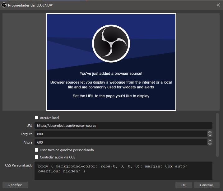 Essa janela irá abrir depois que você confirmar que quer criar uma nova fonte de navegador. Recomendo dê o nome de “LEGENDA”, assim você terá melhor controle das fontes que você já adicionou no programa e é a mesma coisa tanto para OBS quanto para Streamlabs
