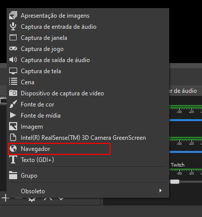 - Com o Streamlabs ou com o OBS aberto, insira uma nova fonte do navegador conforme mostram as imagens abaixo (No Obs, a opção é NAVEGADOR; No streamlabs, a opção é FONTE DO NAVEGADOR)